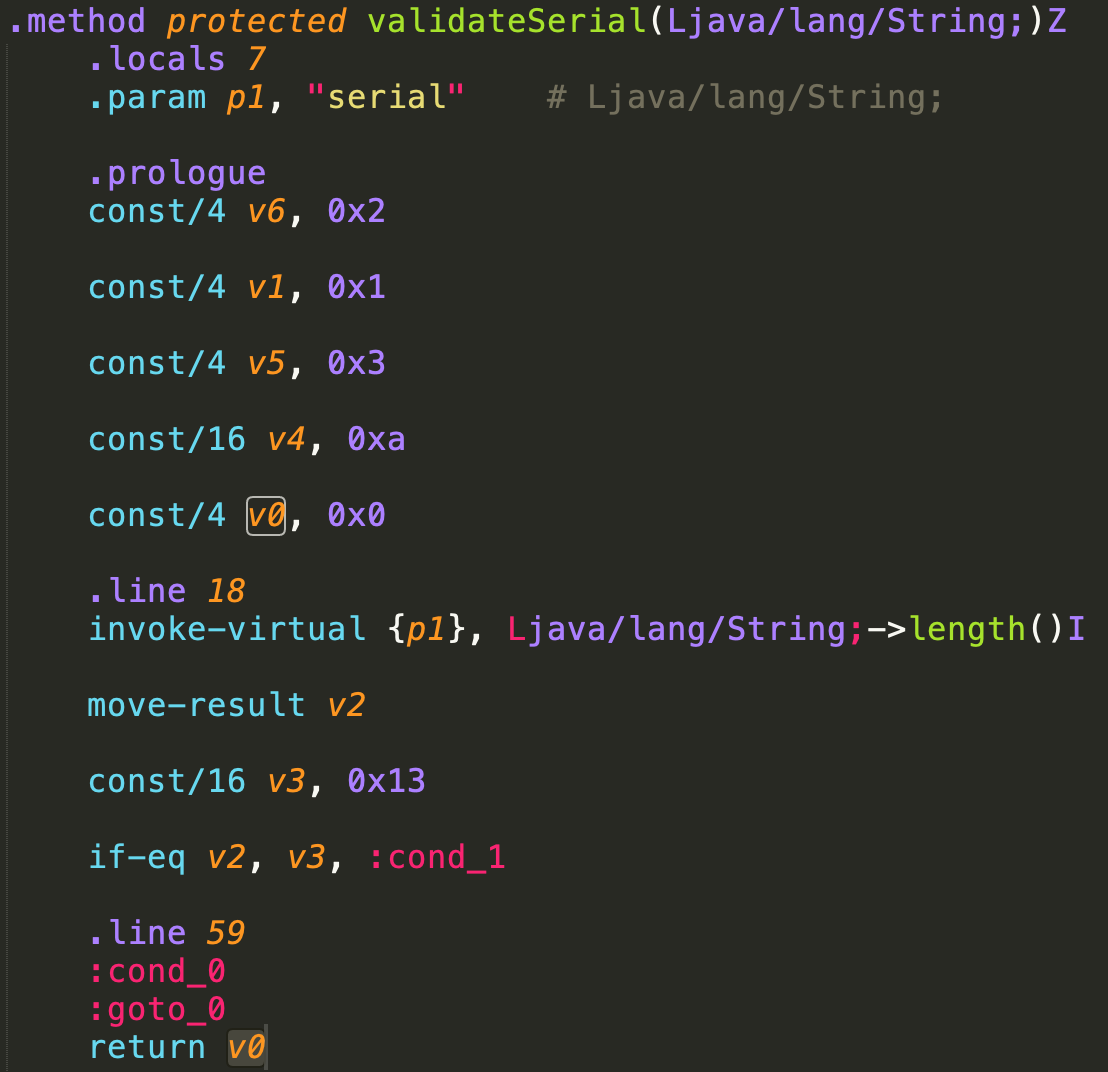 checkPassword 메소드에서는 이 문자열을 다시 validateSerial 메소드의 인자로 하여 호출을 하고, 결과값이 1이 아니면 인증 실패 루틴으로 이동하게 됩니다. 따라서 validateSerial 메소드에서 1을 반환할 조건을 분석해 봅니다.