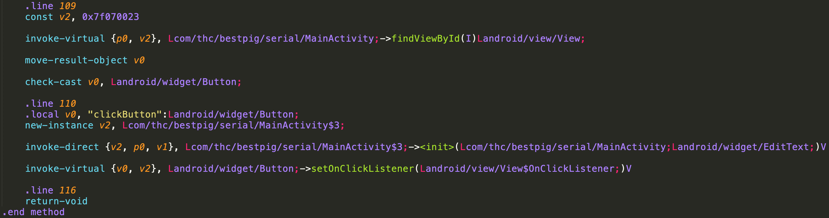 Id가 0x7f070023 View 를 가져와서 버튼인지 확인을 하고, MainActivity$3의 <init> 함수를 호출하고 버튼에 Click Listener 을 설정합니다.