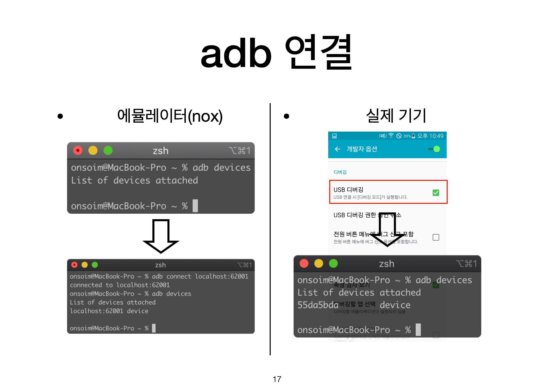 실제 기기의 경우에는 개발자 옵션 중 하나인 usb 디버깅을 허용해주면 됩니다.